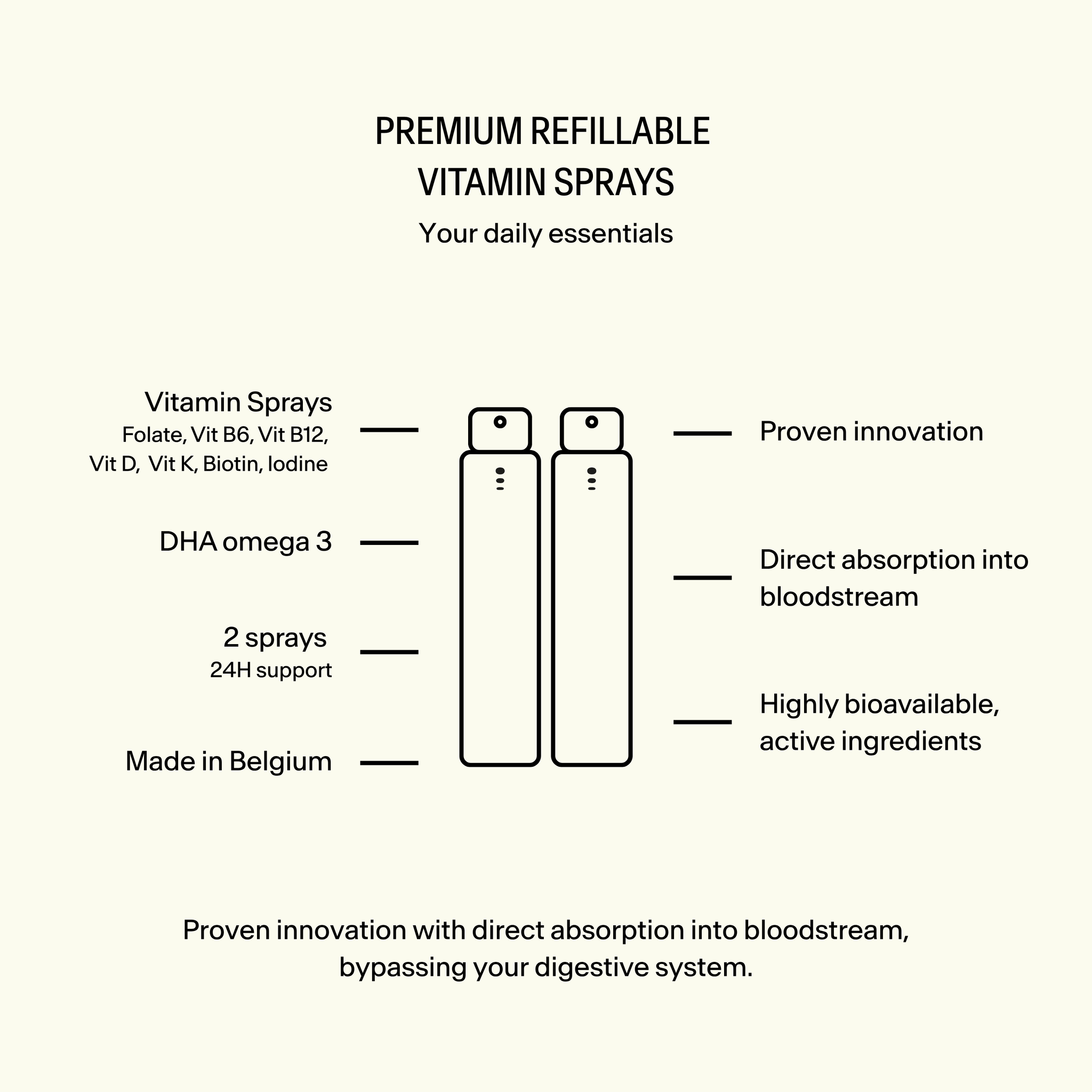 Actieve ingrediënten3 SPRAYS% RI/AR**Folaat (calcium-L-methylfolaat)200 μg100%Vitamine B12 (methylcobalamine)500 μg20000%Vitamine B6 (pyridoxal-5-fosfaat)1,4 mg100%Biotine (D-biotine)50 μg100%Jodium (Kaliumjodide)150 μg100%