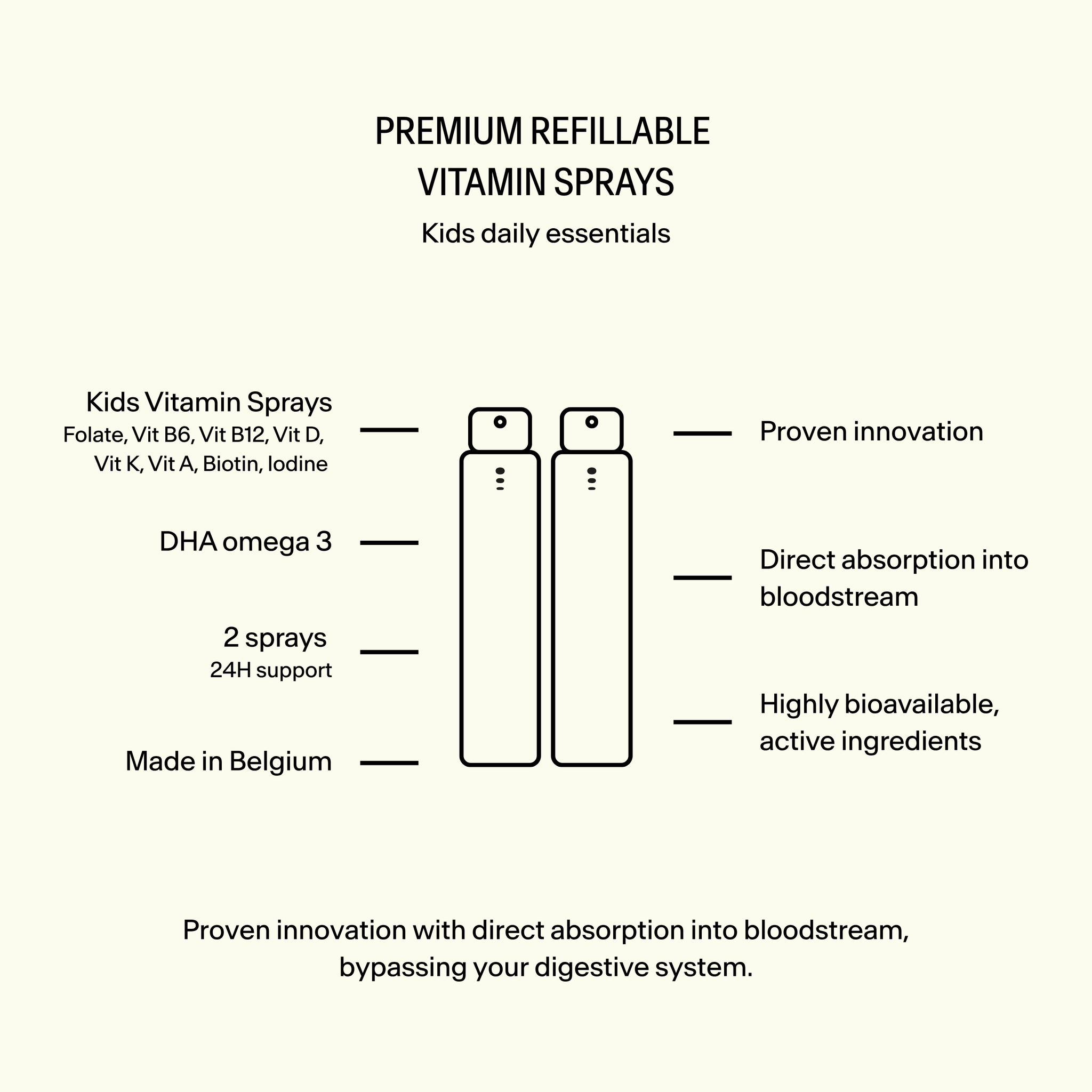 Twee kindvriendelijke sprays met 9 essentiële voedingsstoffen om de natuurlijke ontwikkeling van je kind te ondersteunen. Eenvoudig, dagelijks en natuurlijk.